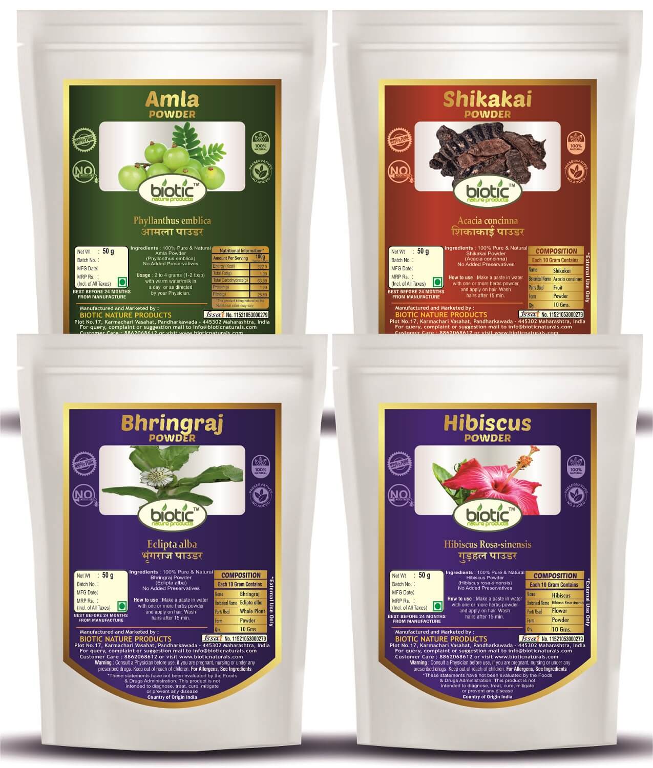 We the “Biotic Nature Products” are Online Supplier of Natural and Herbal Powders and also Raw Herbs. We believe in dealing quality products. In a short span time, we have over 3 lacs satisfied customers all over India. We supply good quality produce that too at very competitive rates to retail customers. Hence, now a days, we are considered at first few top-most suppliers on e-commerce sites. Amla, Bhringraj, Shikakai and Hibiscus Powder for Hair – 200 gm (Pack of 4)