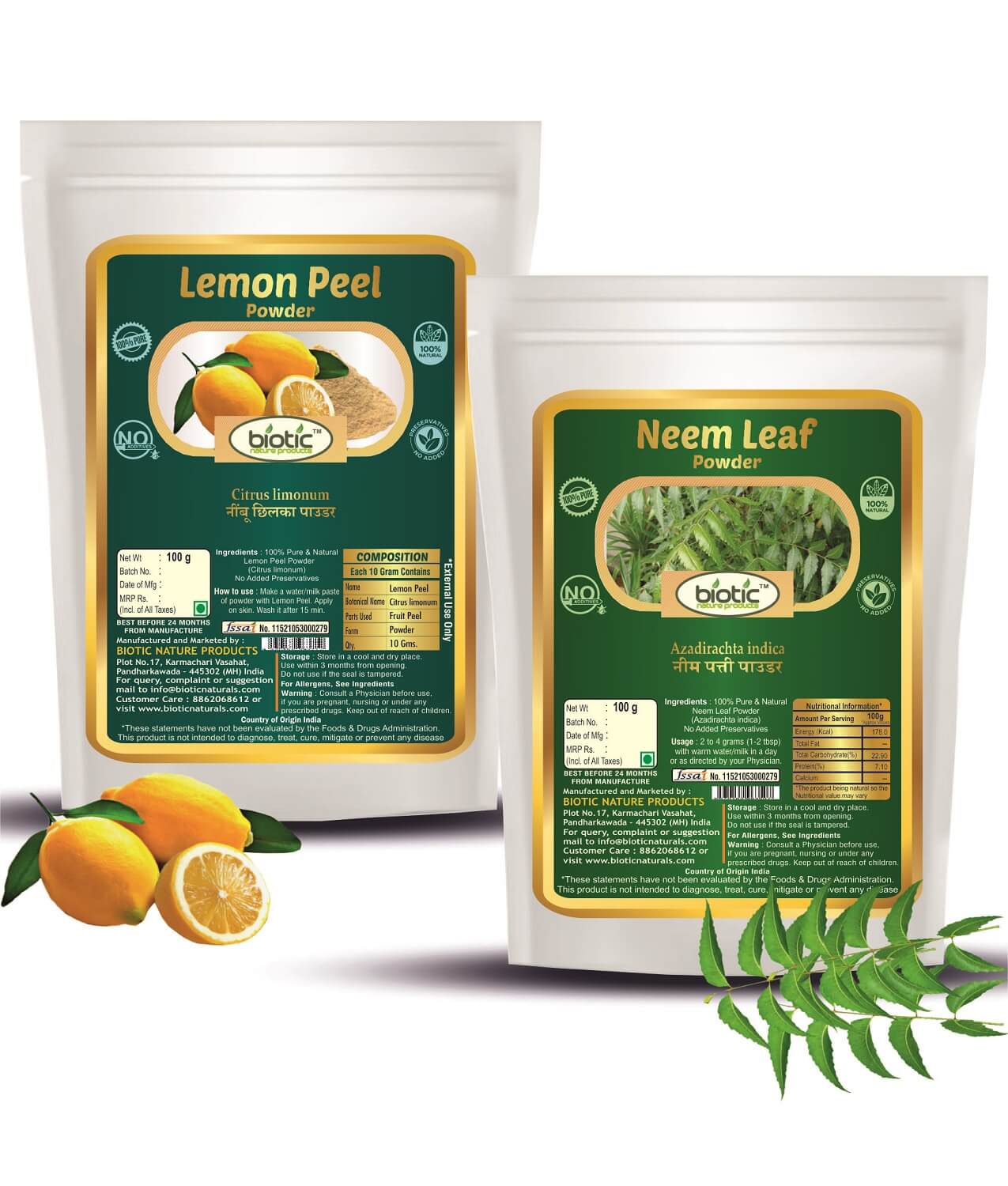 We the “Biotic Nature Products” are Online Supplier of Natural and Herbal Powders and also Raw Herbs. We believe in dealing quality products. In a short span time, we have over 3 lacs satisfied customers all over India. We supply good quality produce that too at very competitive rates to retail customers. Hence, now a days, we are considered at first few top-most suppliers on e-commerce sites. Biotic Lemon Peel Powder and Neem Leaf Powder for Face – 200g (100g each)