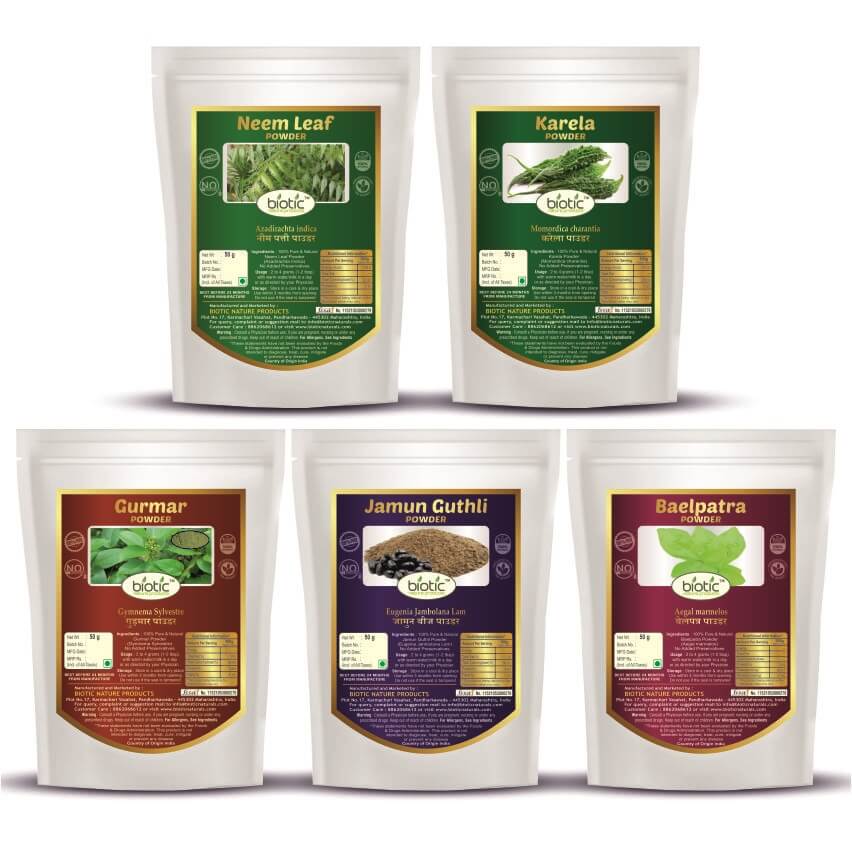 We the “Biotic Nature Products” are Online Supplier of Natural and Herbal Powders and also Raw Herbs. We believe in dealing quality products. In a short span time, we have over 3 lacs satisfied customers all over India. We supply good quality produce that too at very competitive rates to retail customers. Hence, now a days, we are considered at first few top-most suppliers on e-commerce sites. Biotic Neem, Karela, Gurmar, Baelpatra and Jamun Seed Powder for Diabetes – 250 gms (50 gms each)