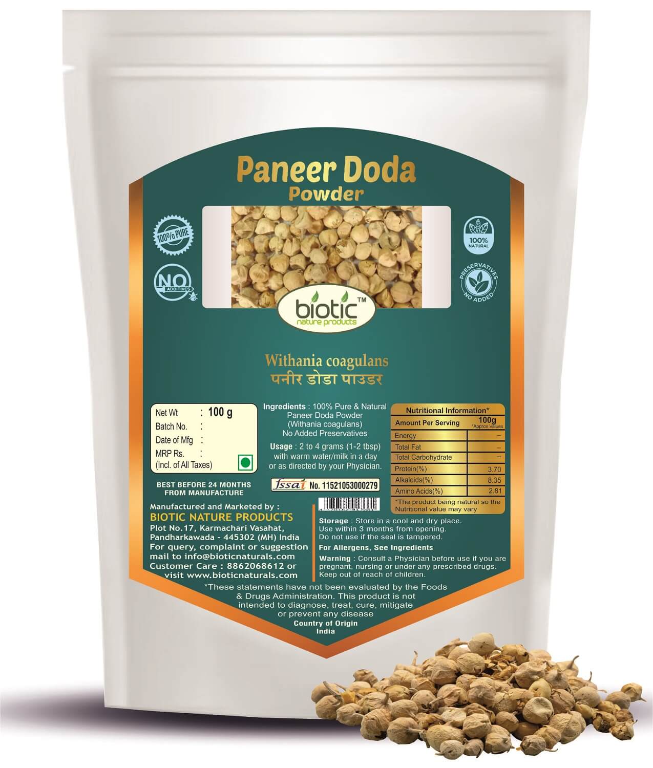 Other Names : Paneer Dodi Powder, Paneer Doda Powder, Paneer Fruit, Withania coagulans, Paneer phal, Indian rennet, Vegetable rennet, Paneer bandh, Panirband, Punir, amakiregadday, asvagandhi, Punir dodi, Akri, panneru-gadda, pennerugadda, Vegetable Rennet