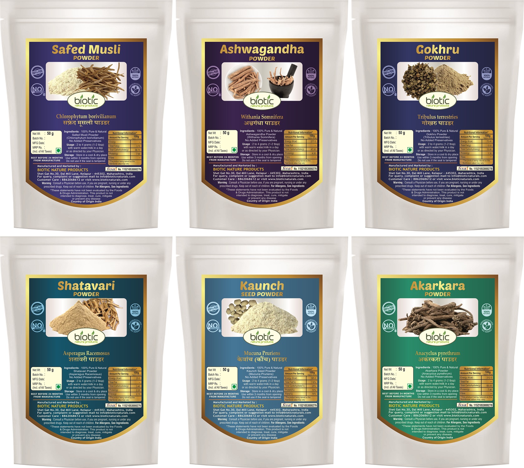 We the “Biotic Nature Products” are Online Supplier of Natural and Herbal Powders and also Raw Herbs. We believe in dealing quality products. In a short span time, we have over 3 lacs satisfied customers all over India. We supply good quality produce that too at very competitive rates to retail customers. Hence, now a days, we are considered at first few top-most suppliers on e-commerce sites. Biotic Safed Musli, Ashwagandha, Shatavari, Kaunch, Gokhru, Akarkara Powder – 300gms (50gms each)